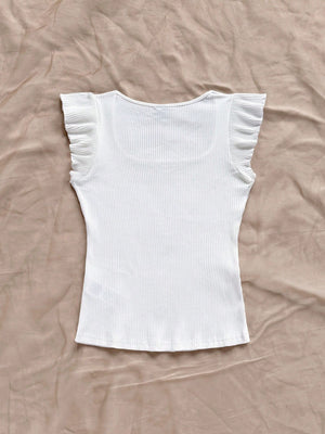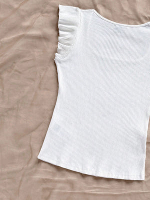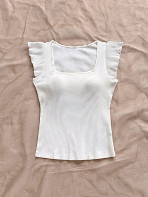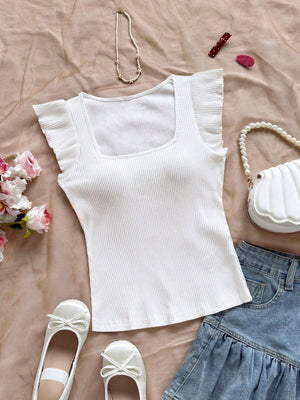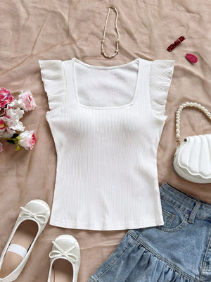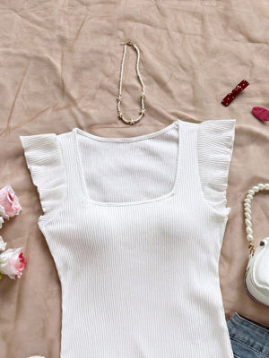 This playful Solid-Colored Ribbed Knit Cap-Sleeve Tee brings a fun twist to casual beachwear. Featuring a slim fit and a scoop neckline, it hugs your silhouette, while the ruffle and rib-knit details add charming texture. The cap sleeves and regular hem make it perfect for sunny days by the shore or relaxed outings. Embrace effortless style with this versatile, comfy tee!