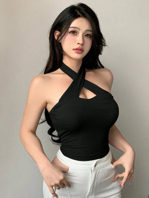 Solid Color Wrapped Halter Neck Slim Fit Tank Top Summer