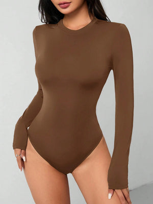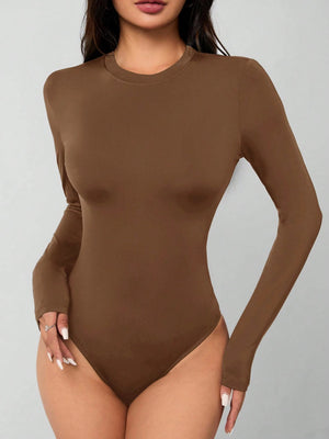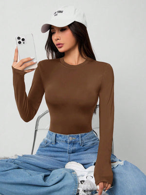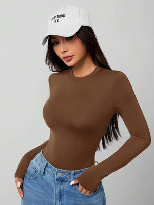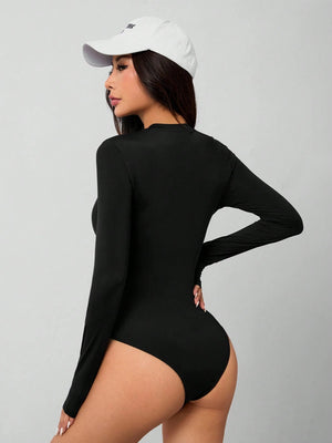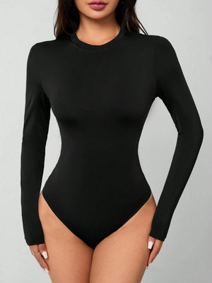 Experience ultimate comfort and style with this sleek black bodysuit, crafted from premium knitted fabric with high stretch for a perfect fit. The solid design features a round neckline and long sleeves, making it ideal for both sports and workout sessions. With its slim fit silhouette and backless detail, this versatile piece effortlessly transitions from gym to casual wear.