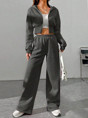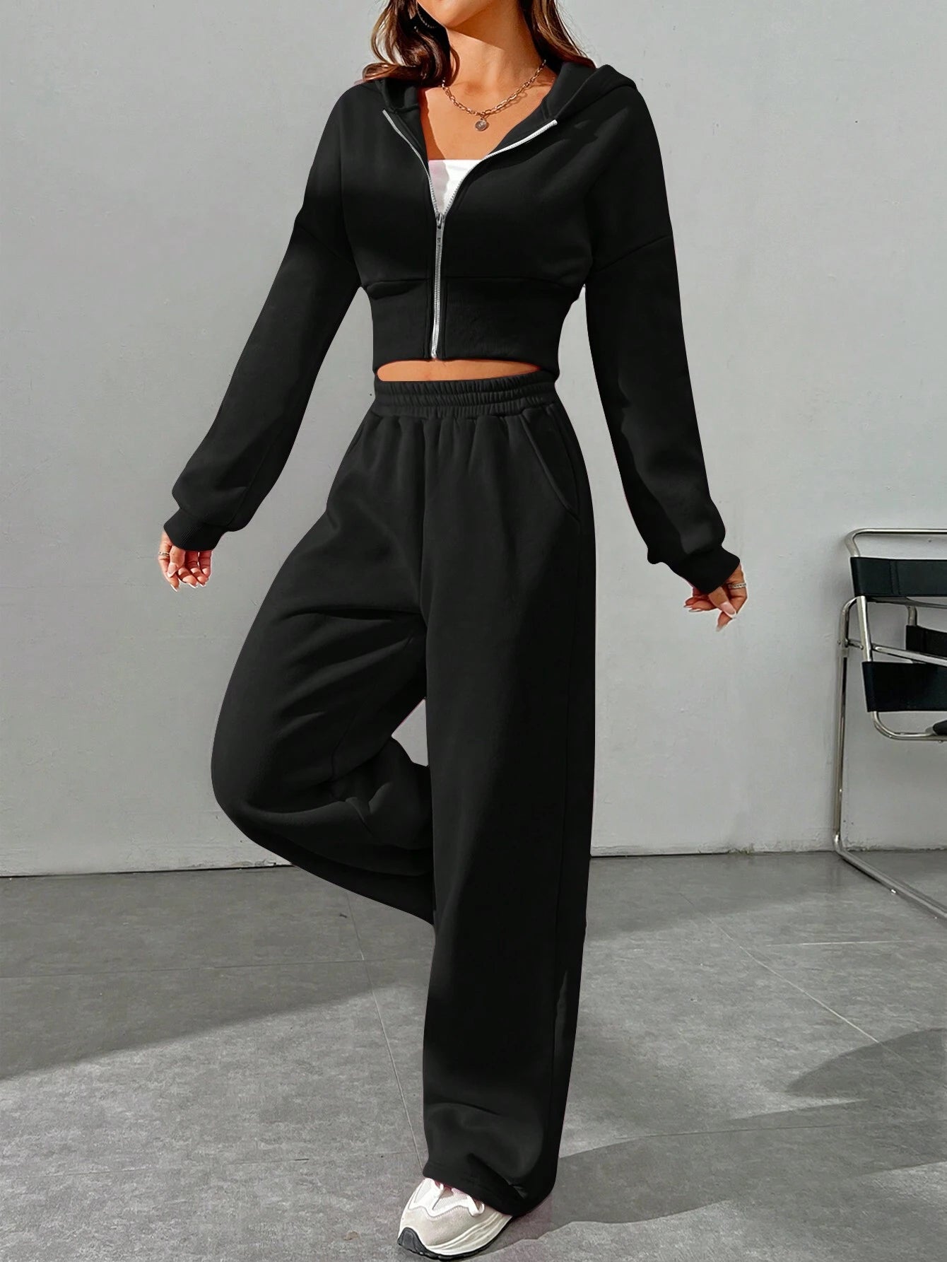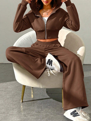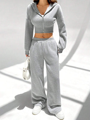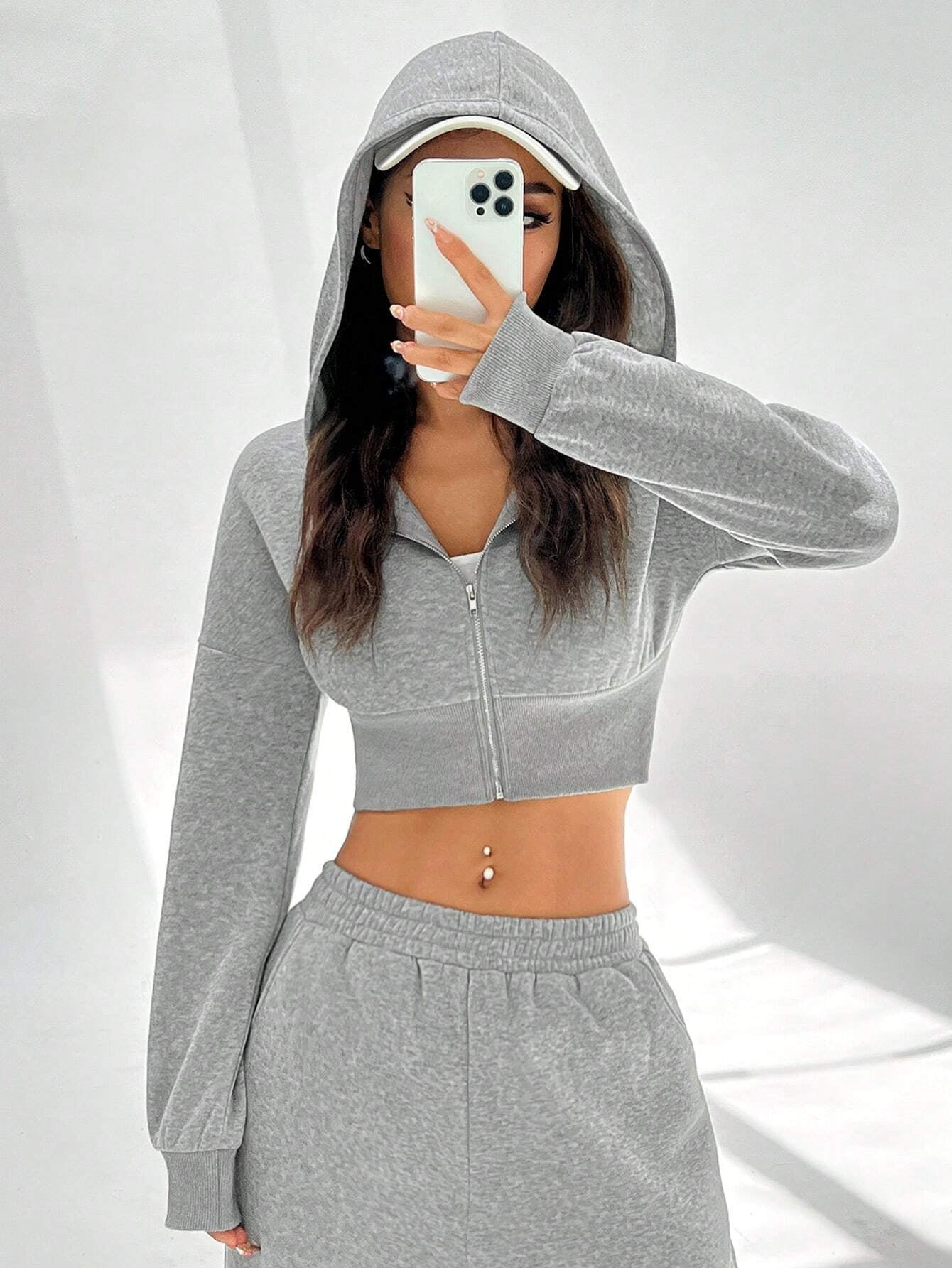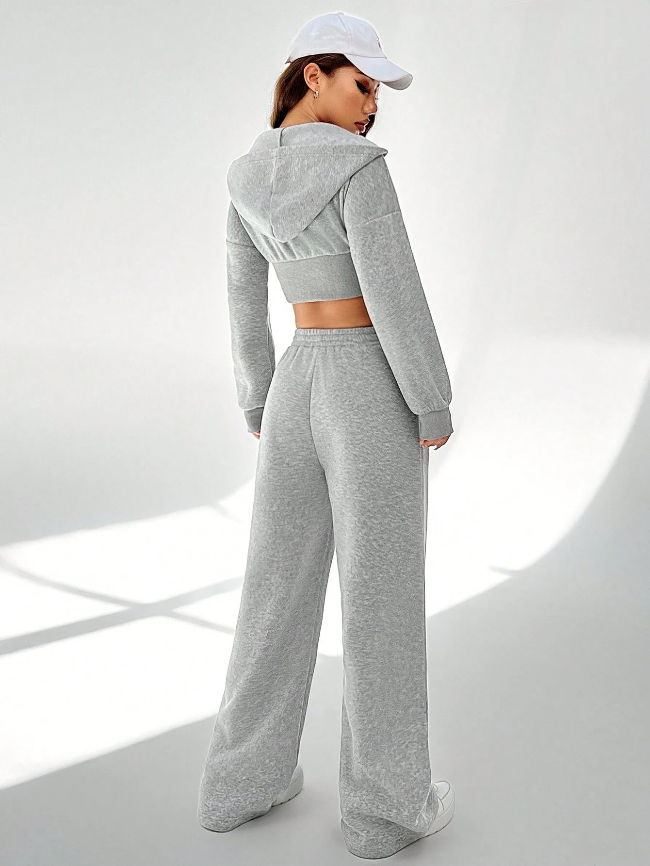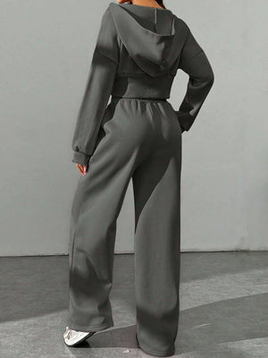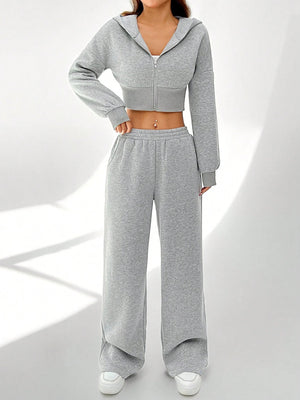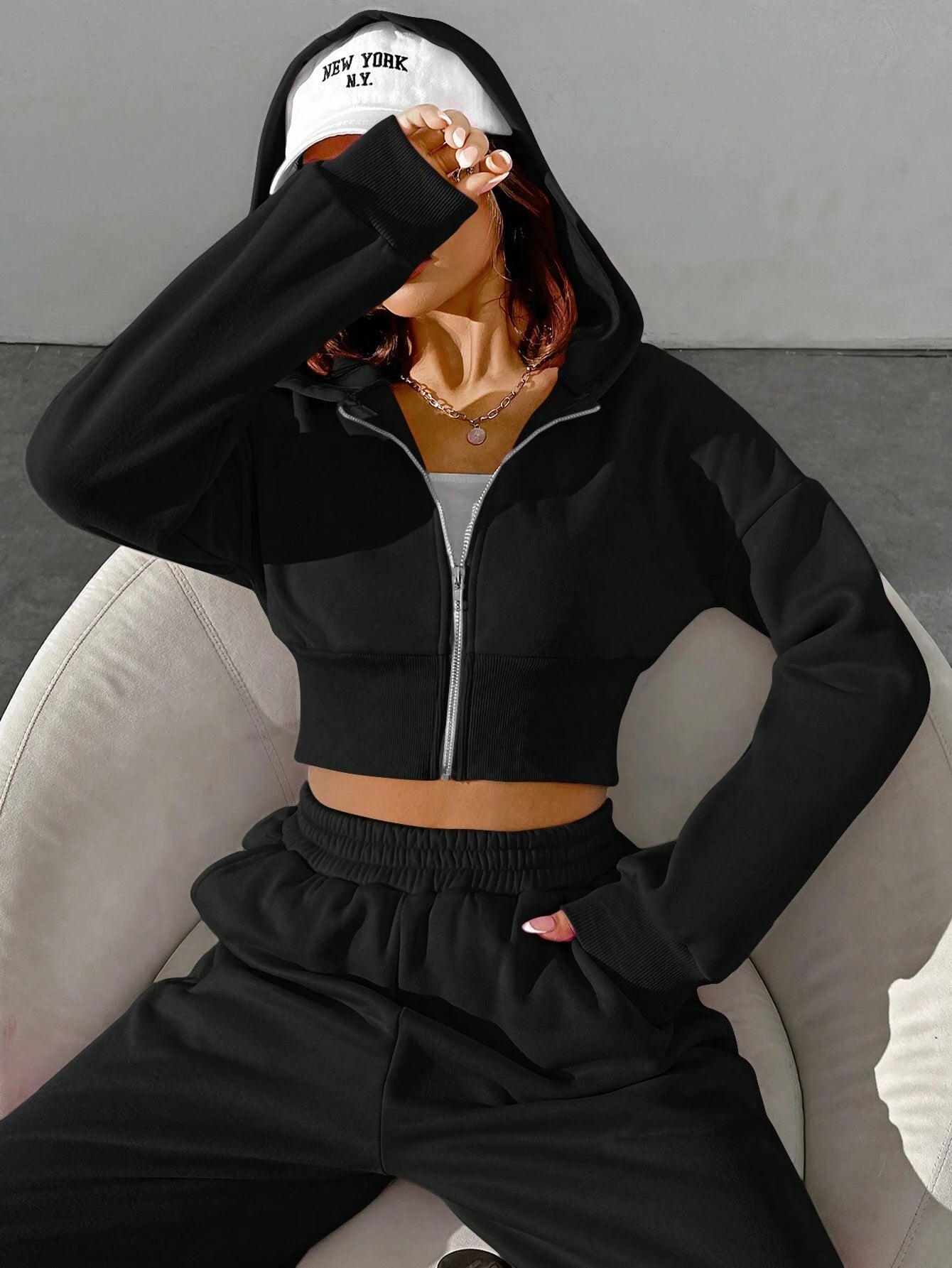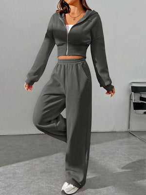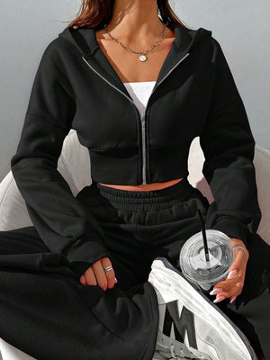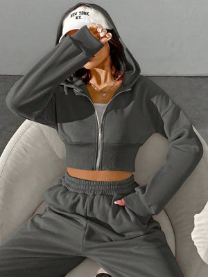 The cropped sweatshirt features a convenient zip-front closure, functional hood, and stylish drop shoulders, while thoughtful shirred details and pockets add both functionality and visual interest. The matching long pants complete the look, creating a coordinated outfit that's perfect for casual outings, festivals, or relaxed weekends.