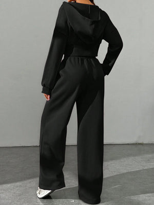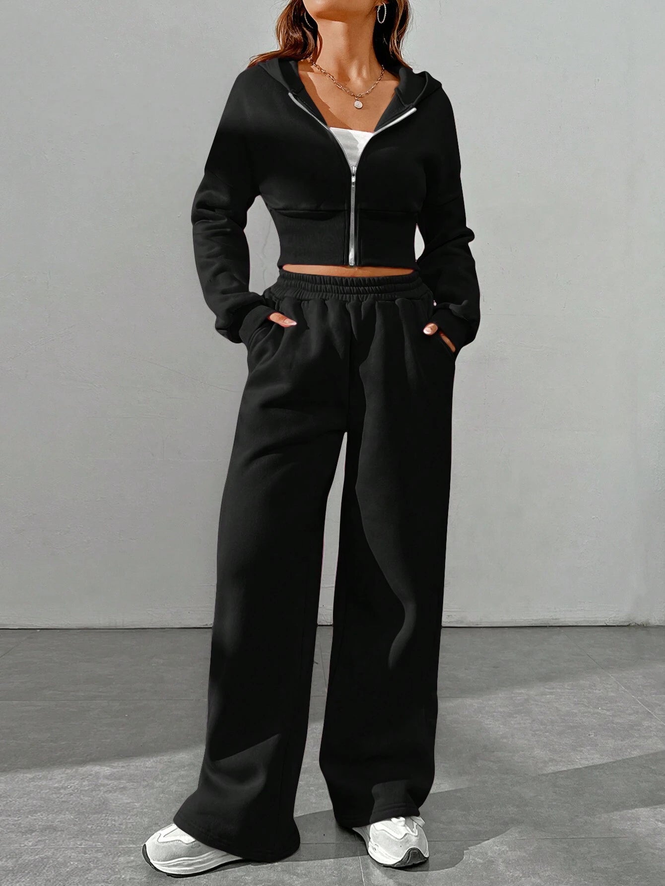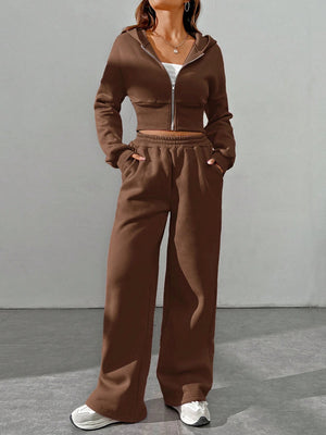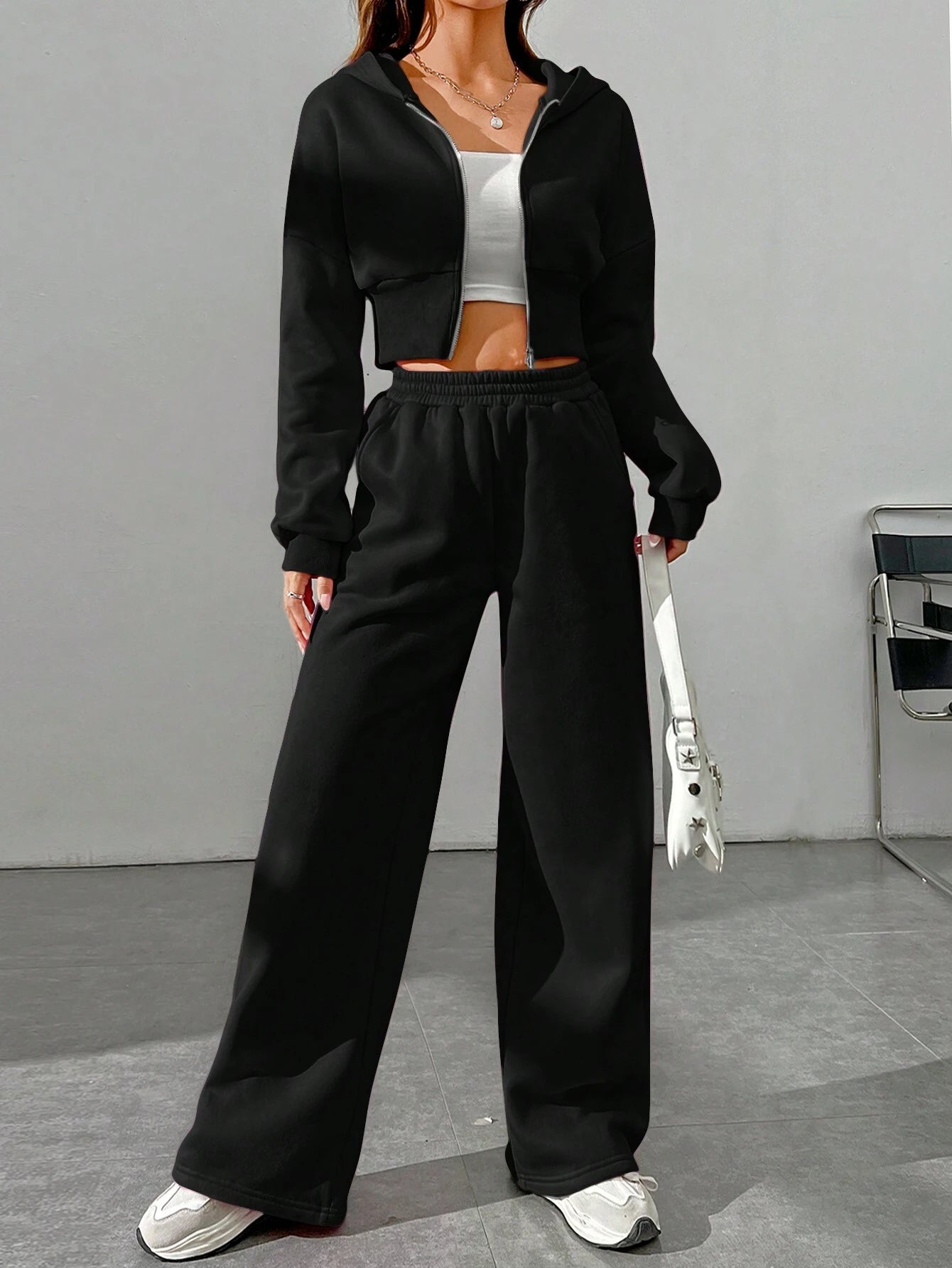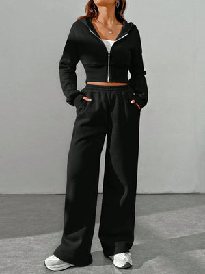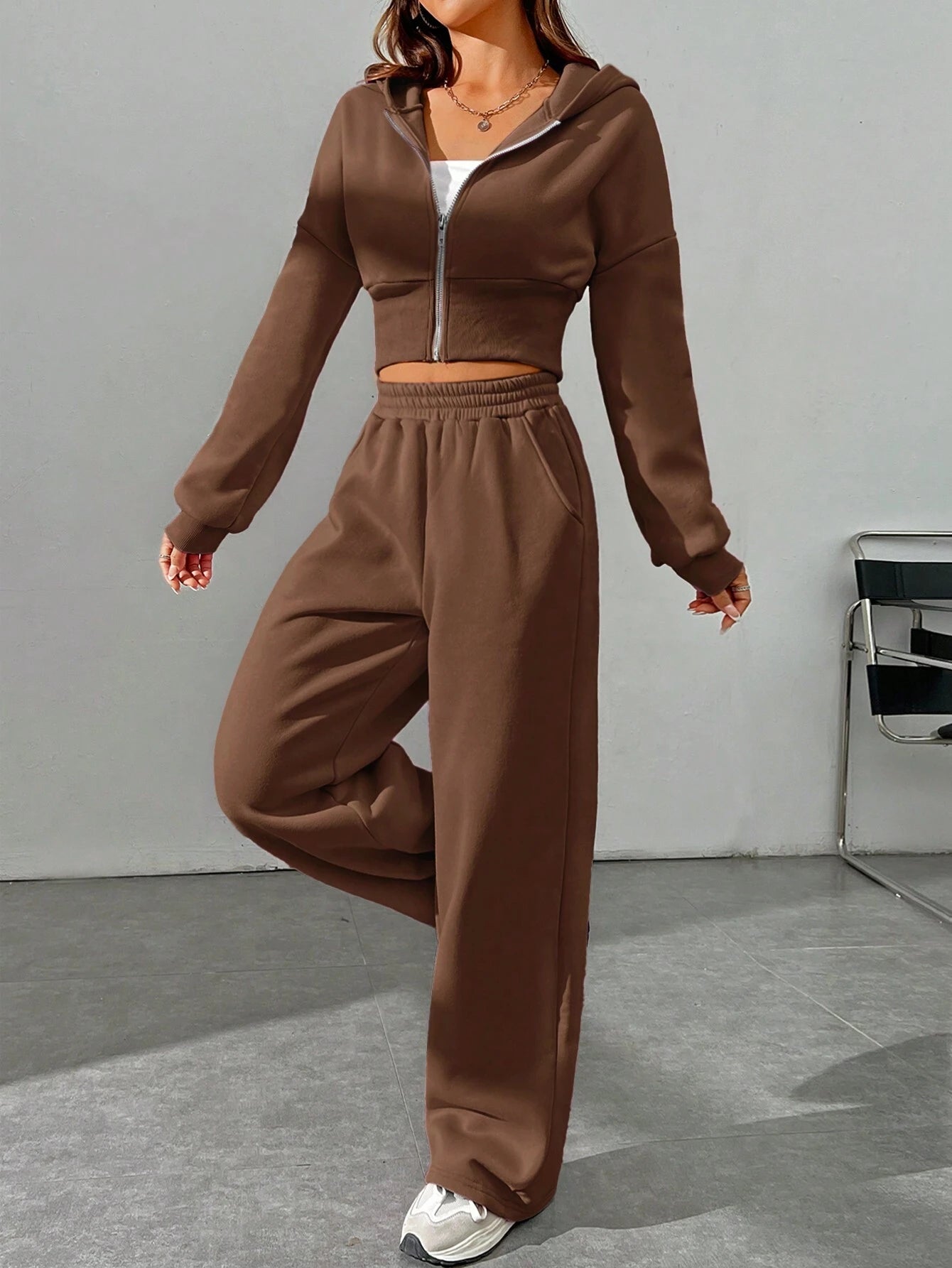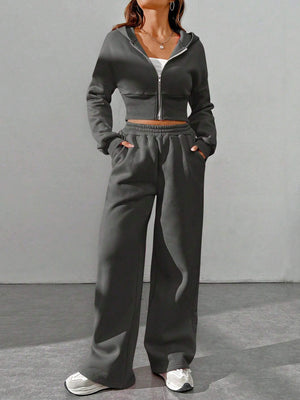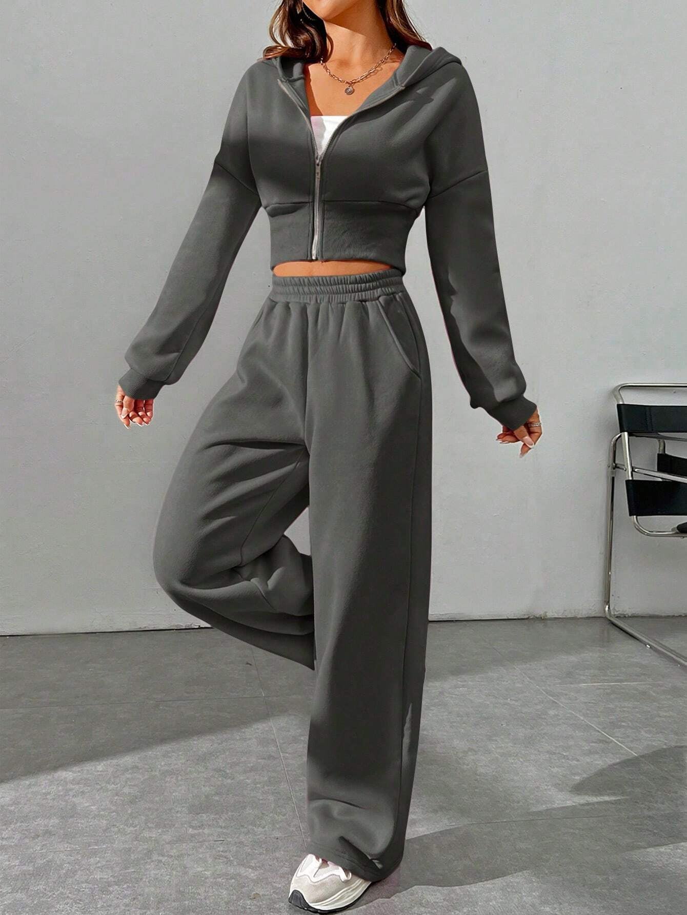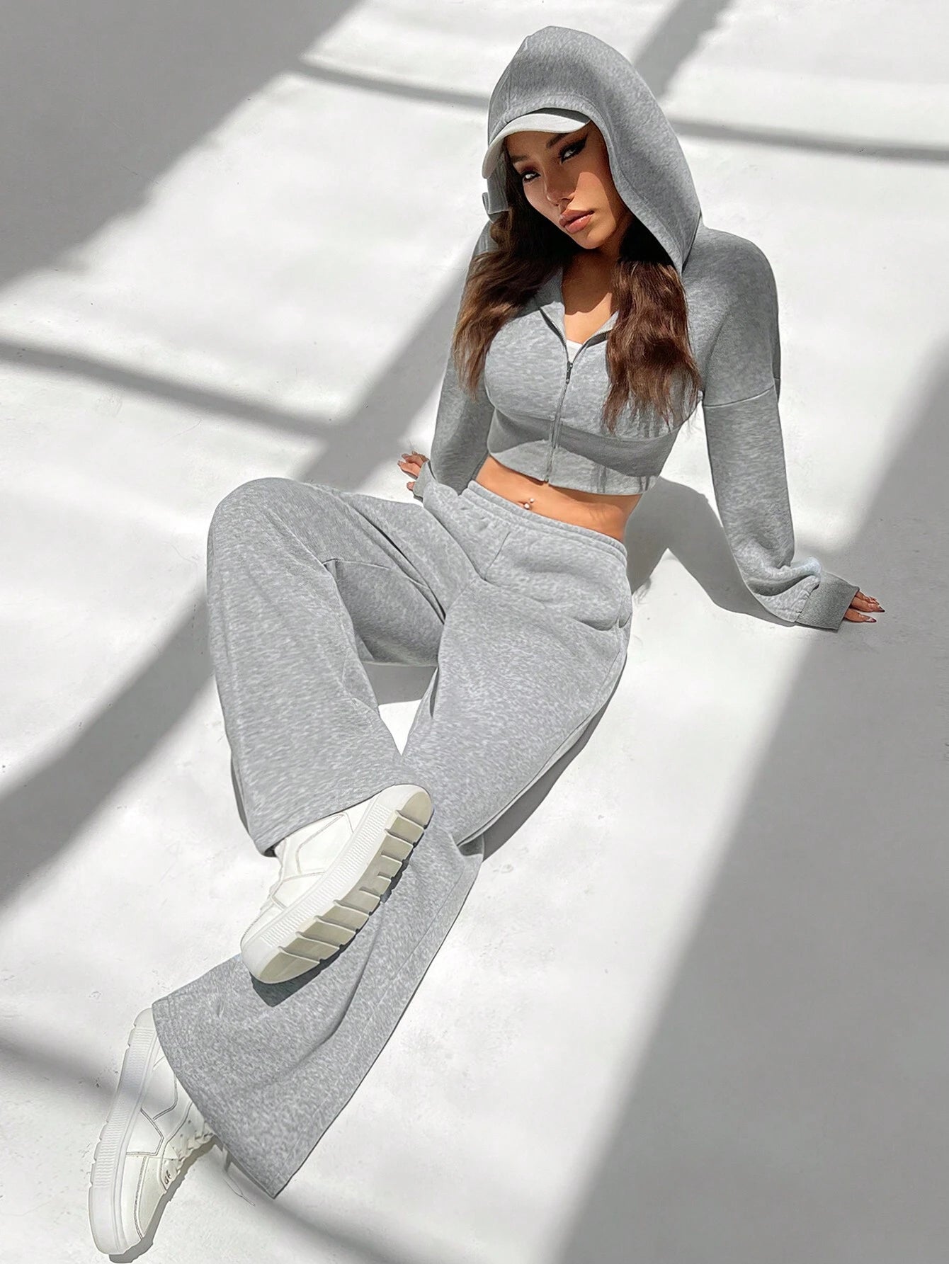 The cropped sweatshirt features a convenient zip-front closure, functional hood, and stylish drop shoulders, while thoughtful shirred details and pockets add both functionality and visual interest. The matching long pants complete the look, creating a coordinated outfit that's perfect for casual outings, festivals, or relaxed weekends.