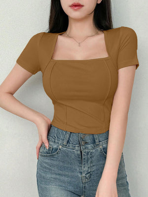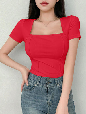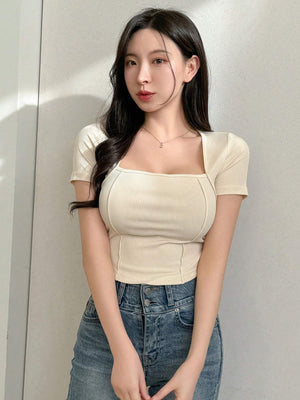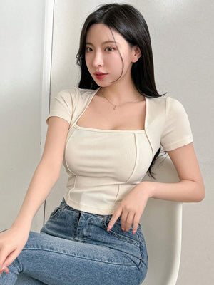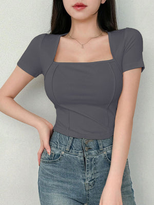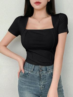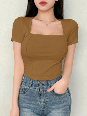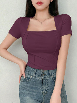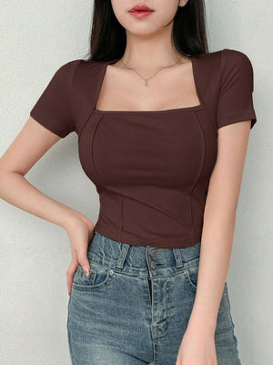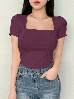 Indulge in luxury with our Women's Solid Color Swan Collar Short Sleeve T-Shirt. This piece features a stunning rib-knit finish and square neck design, making it both casual and elegant. Its crop and slim fit provide a flattering silhouette, while the medium stretch material of 93% Polyester and 7% Elastane offers comfort and style. Elevate your wardrobe with this must-have item.